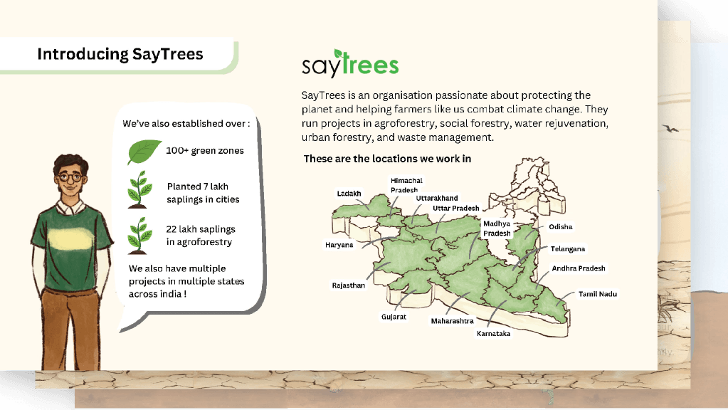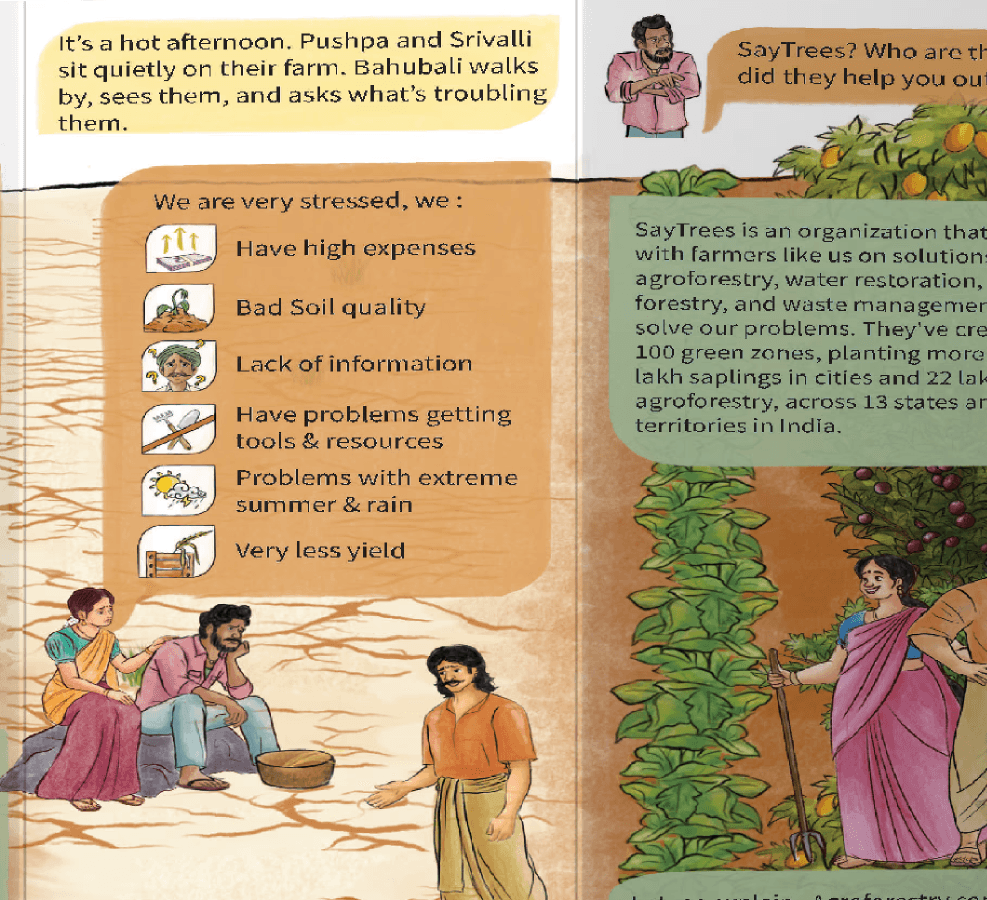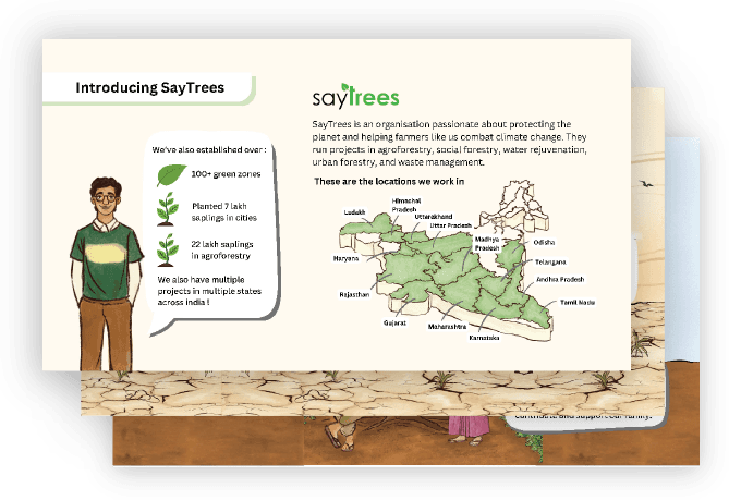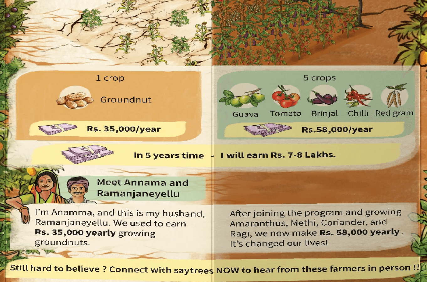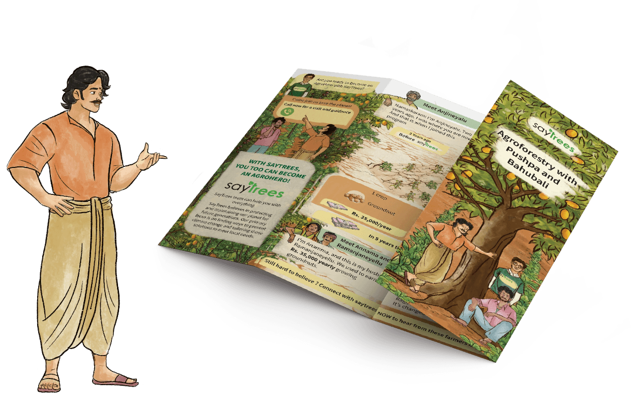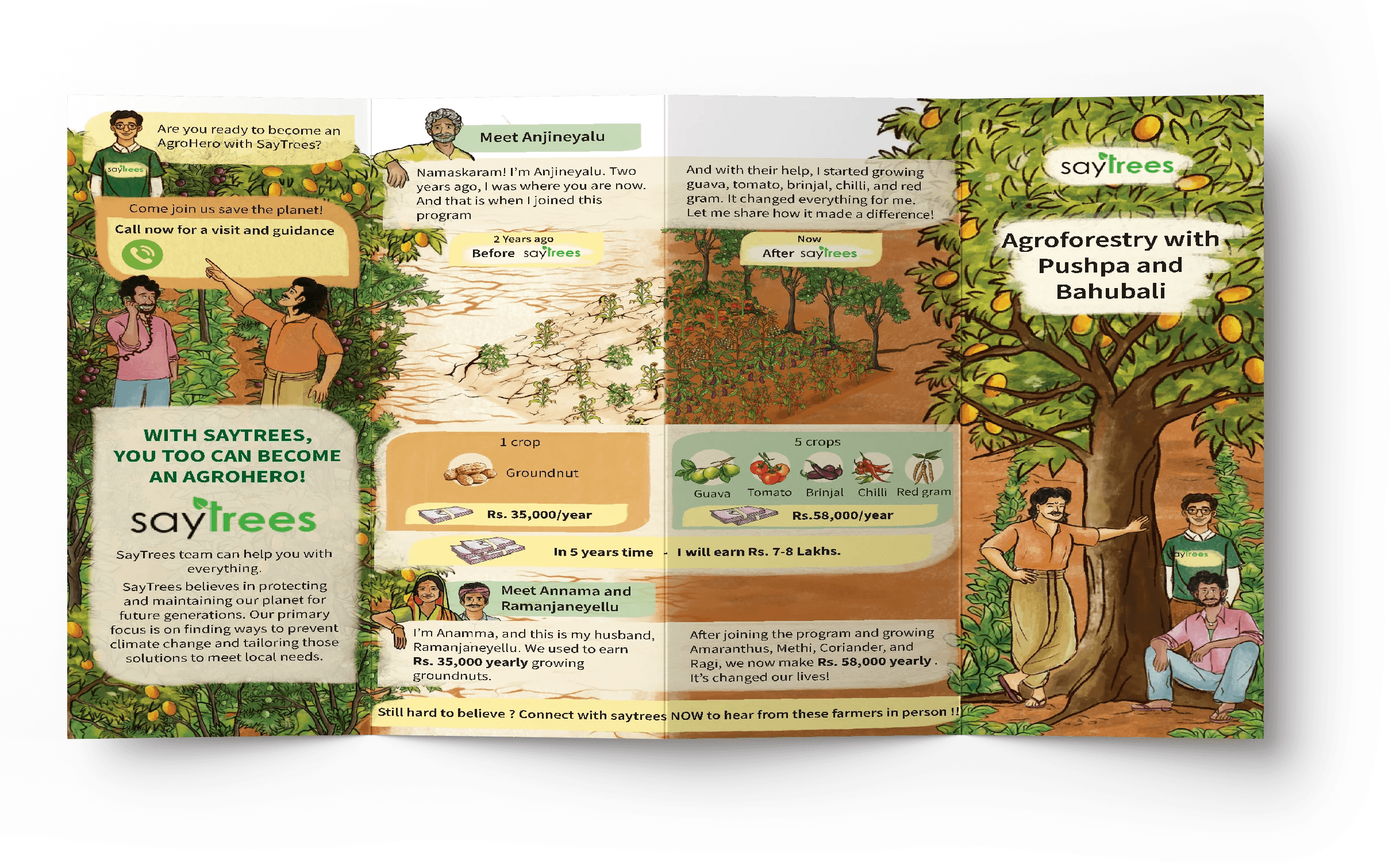 Working closely with SayTrees’ experts and the field team, we co-created simple, low-literacy tools: brochure, presentation, and booklet and designed a delivery system that matched the natural rhythm of the farmer’s journey.