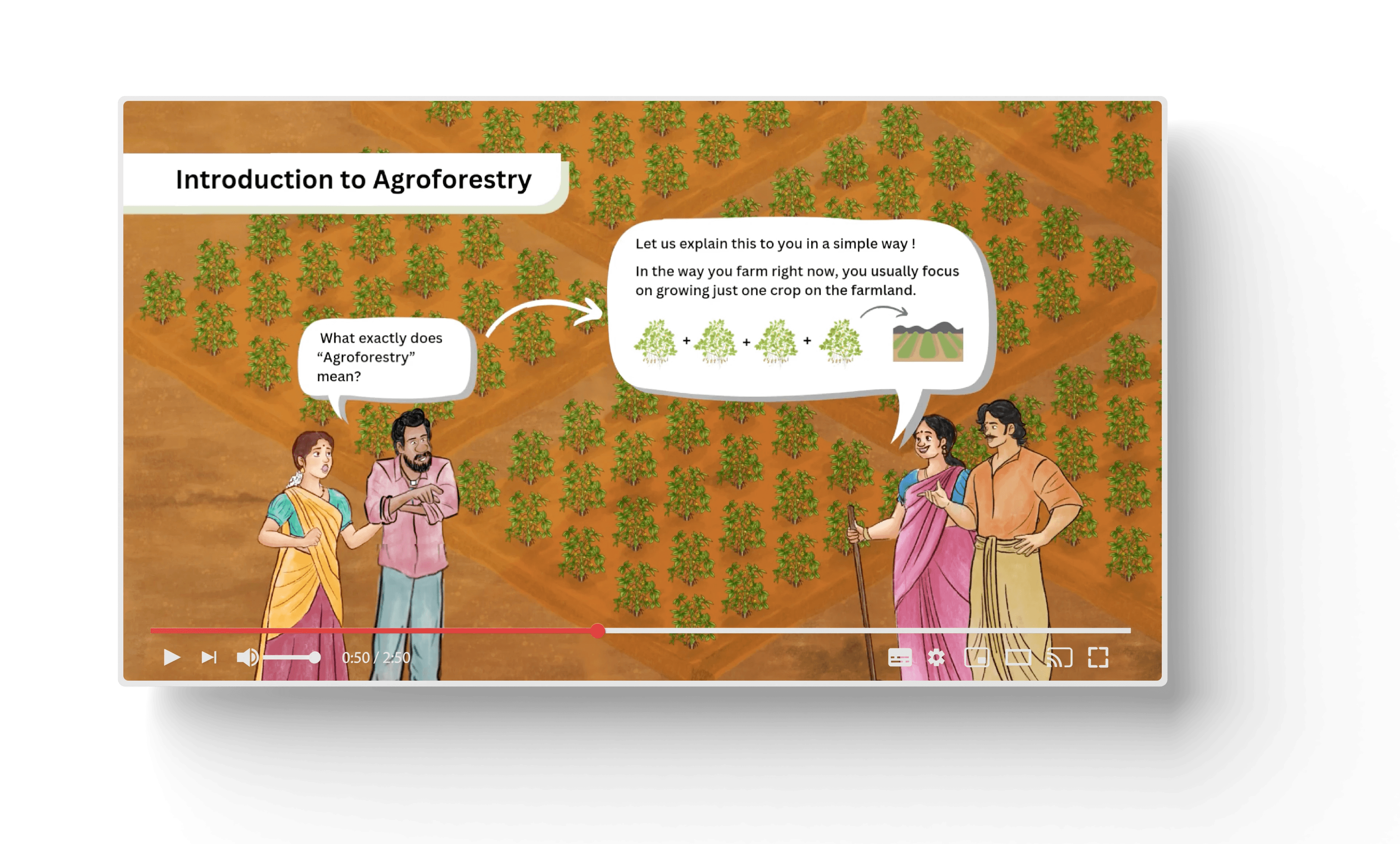 We created behaviorally-informed tools that help farmers understand agroforestry's real impact on their land and income. Using locally loved characters like Bahubali and Pushpa, we made the 5-year journey tangible and trustworthy for farmers and field teams through comics, brochures, and presentations.