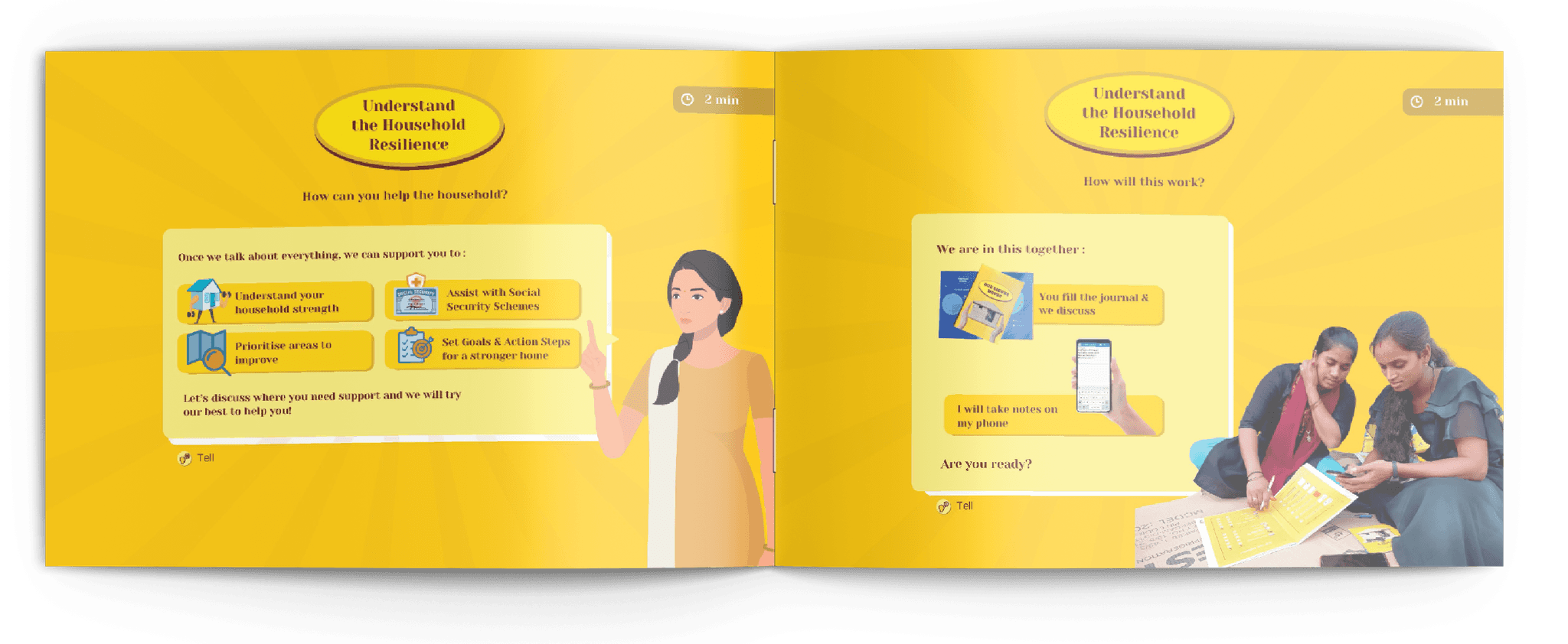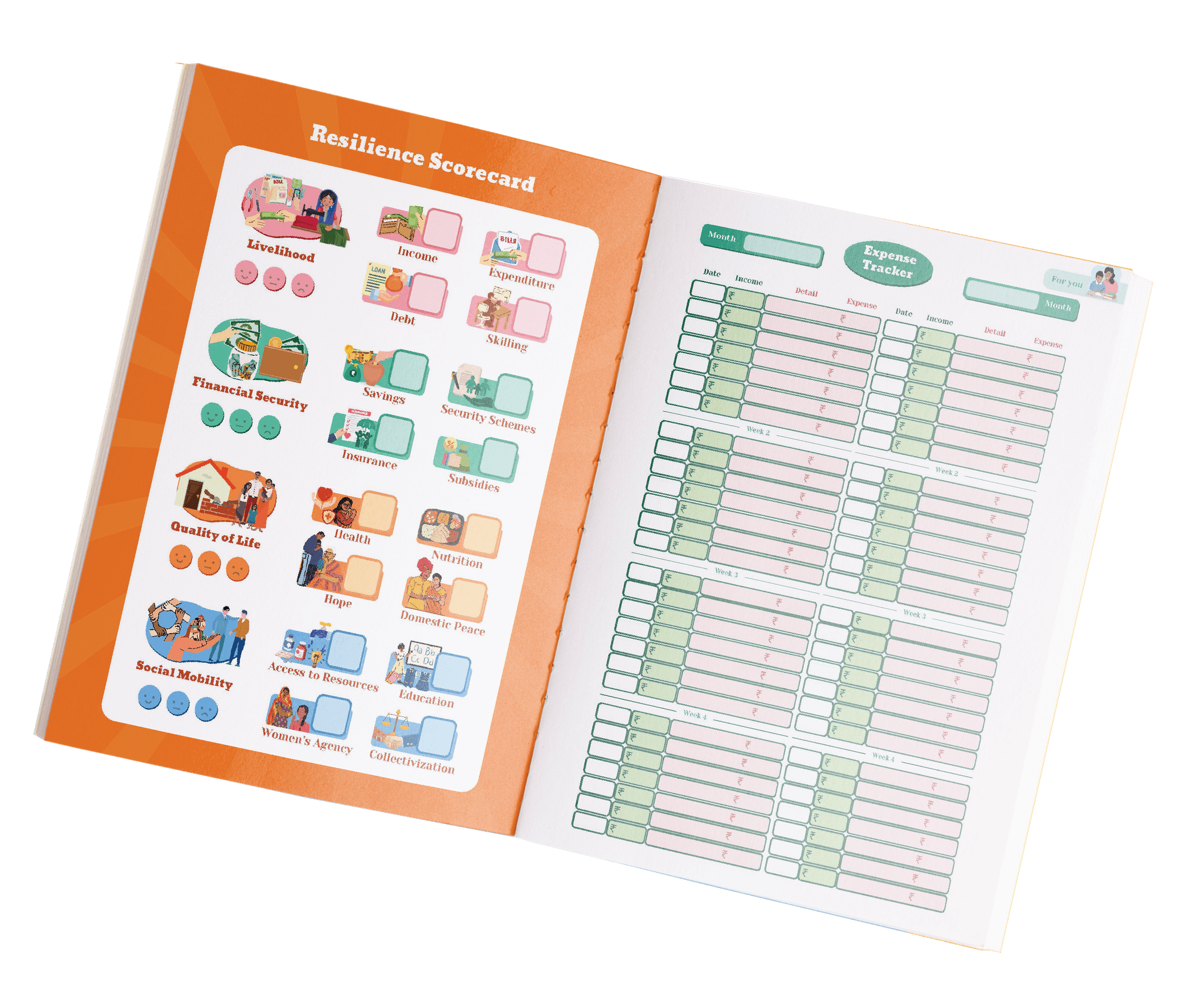 To make the concept of economic resilience accessible and actionable, we created a playful, visual journal for community members. Designed with behaviour science principles, the journal uses nudges, prompts, and illustrations to help people map their resilience journey clearly. Alongside it, an action-oriented field guide, was aimed to simplify facilitation for community-facing teams while holding space for sensitive conversations.
